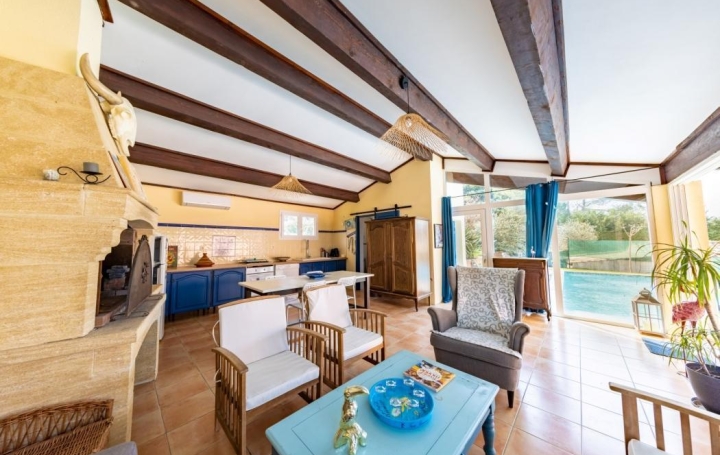 On the edge of a pine forest, in a calm and pleasant setting, discover this Provençal house of 121m² on one level on a beautiful plot of 1606m². A beautiful living room of 50m² with insert in central element, new separate kitchen, two beautiful bedrooms, a bathroom and a large laundry room with storage. You will also enjoy 50m² of attic space that can be used as a bedroom or office room. On the outside, an exceptional summer and relaxation area with its swimming pool, its terrace and its 42m² summer kitchen which you can enjoy half the year. Drilling, basement, air conditioning.