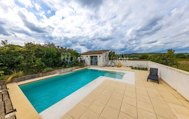 At the end of a dead end, sheltered from view, cover this beautiful single-storey villa of 135m2 of living space. Inside, a beautiful 45m2 living room opening onto a beautiful terrace to the west, a semi-open kitchen, 4 bedrooms including a master suite, bathroom, separate WC. Outside, you will enjoy a beautiful terrace and its view of the Mont C venole mountain range, 8x4 swimming pool with jacuzzi area, an outbuilding/summer kitchen and a garden area. Garage, shelter, air conditioning, underfloor heating. Beautiful volumes, calm and great amenities for a house located in a pleasant village less than 30 minutes from N mes.